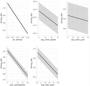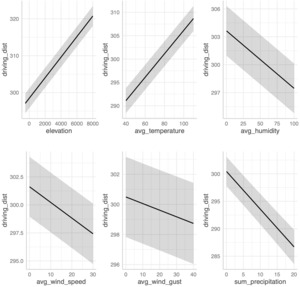 Turning to driving distance as the dependent variable, weather predictors account for a substantial portion of the variance. As shown in Table 4, the baseline model without weather variables yields an R² of 0.398. In comparison, the full weather model includes elevation and average temperature, which are both positively associated with driving distance, as well as average humidity, wind speed, wind gusts, and sum of precipitation, which are each negatively associated. This specification achieves an R² of 0.513, representing a 28.9% relative increase in explanatory power and underscoring the importance of weather conditions in driving performance.
