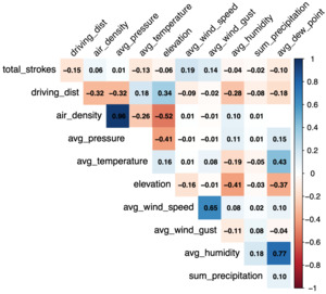 Table 2 displays summary statistics for the dependent variables used in the models as well as weather measurements and round details. Total strokes are distributed around a mean of 70.804, such that the best round for any golfer in the data shoots an astonishing 59, while the worst shoots 92. The average distance on drives across the dataset is just under 290 yards. Some events do not include average driving distance data because they are not administered by the PGA TOUR, even though they are considered official PGA TOUR events. These include majors such as the Masters, the U.S. Open, and The Open Championship. Our weather variables show that at golf events, conditions can vary due to differences in location, time of year, time of day, and elevation. The average tee-time start at events is roughly 10:30 a.m. local time. As each round progresses, fewer observations are recorded for two primary reasons. First, the majority of professional golf events with the stroke play format tend to cut the field after the first two rounds of play based on performance up to that point. Secondly, some golfers will retire throughout the course of an event due to injury or other circumstances, which further reduces the number of participants in an event. The number of observations across each year is close to a uniform distribution, with the lowest percentage coming from 2020, caused by the COVID-19 pandemic. The relationships among the weather variables are presented in Figure 1 as a correlation matrix, displaying only correlations significant at a p-value of 0.05 or lower.