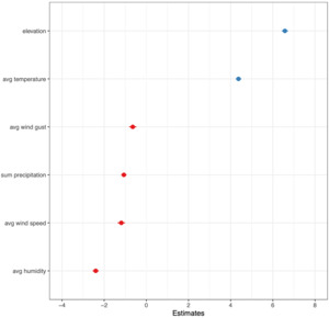 \[\begin{align}Y_{i,j,k} =& \beta_{0} + \ \beta_{1}{Elevation}_{k} + \ \beta_{2}{Temp}_{i,j,k} + \ \beta_{3}{Hum}_{i,j,k} \\&+ \ \beta_{4}{Bar\ Pressure}_{i,j,k} + \ \beta_{5}{Wind\ Speed}_{i,j,k} + \ \beta_{6}{Wind\ Gust}_{i,j,k} \\&+ \ \beta_{7}{Precip}_{i,j,k} + \ \epsilon_{i,j,k}\end{align}\]
