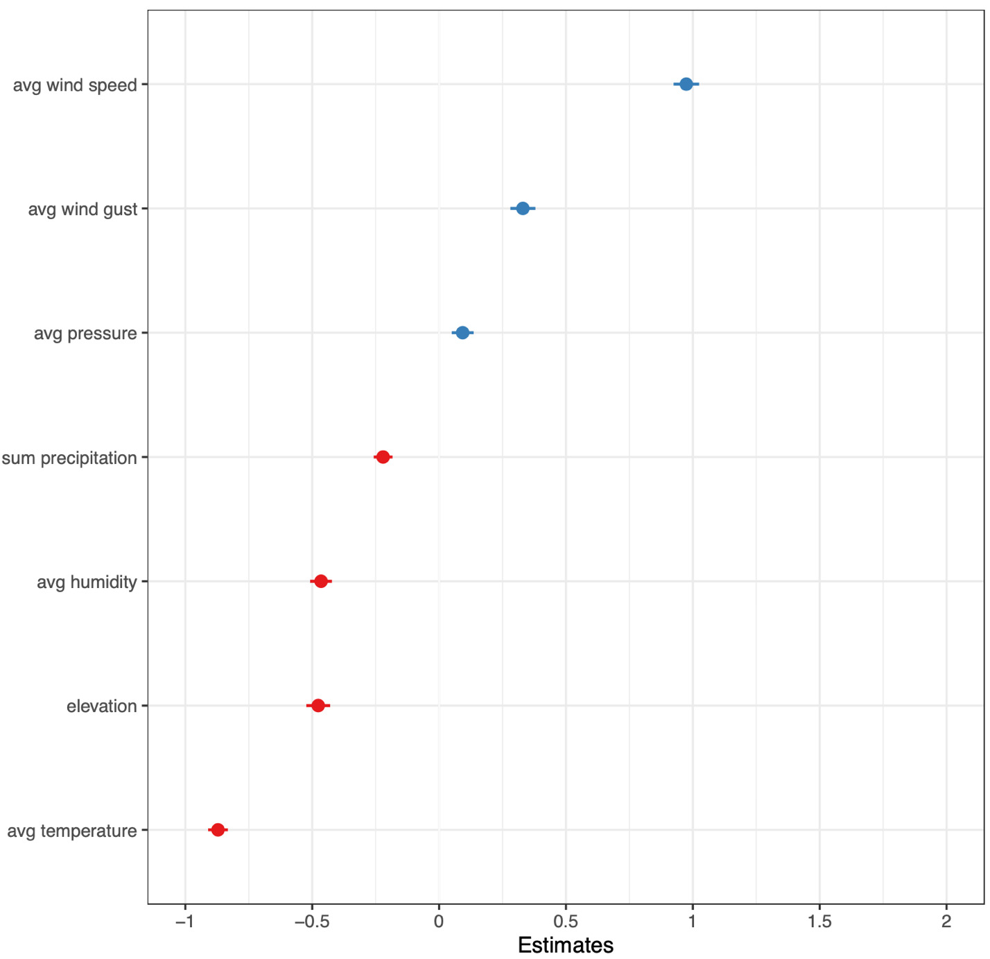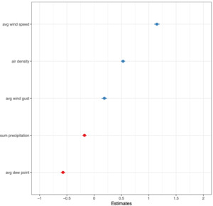 Figure 3a displays the marginal effects of the five variables included in the model with air density on total strokes, while Figure 3b presents the standardized coefficients for this model. Compared to the other four variables, average wind speed displays the greatest variance in the marginal effect on total strokes where an increase of two standard deviations (8.60 mph) is associated with 1.15 additional strokes. Air density also has a large, positive marginal effect on total strokes such that two additional standard deviations (0.01 lb/ft3) of density increases total strokes by 0.53 strokes per round. The plot for average dew point shows the potential of decreasing strokes when dew point is high. Average wind gust shows a moderate positive effect on total strokes, while the sum of precipitation has a moderate negative effect.