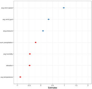 In the third specification, elevation, average temperature, and average humidity are replaced with a composite air density measure and average dew point. All five weather-related variables are statistically significant with negative coefficients. This model achieves an R² of 0.502, slightly below the full weather model (R² = 0.513), but still well above the baseline model (R² = 0.398). This represents a 26.1% relative increase in explanatory power compared to the base model, suggesting that while air density and average dew point capture much of the relevant variation, the disaggregated weather variables offer marginally better predictive performance.