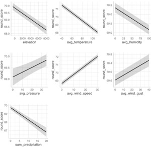 A weighted average was used for temperature, dew point, wind speed, wind gust, pressure, and humidity as timestamps are not always consistent. The weighted average was based on the proportion of time covered by a timestamp within the round time frame. For precipitation during a round and 24 hours before a round, we summed the precipitation recorded from the timestamps within the time frame. If the beginning and end of the 24-hour time period before a round and the time period during the round were in between weather timestamps, we reduced the precipitation by the proportion of time that was covered in the 24 hours. That is, if a golfer’s tee time was 10:00 a.m. and weather timestamps were present at 9:30 a.m. and 10:30 a.m. with 0.1 inches of precipitation recorded at 10:30 a.m., then the summed precipitation during that time period was recorded as 0.05 inches to estimate the amount of precipitation that fell since the beginning of the golfer’s round. We then summed the precipitation 24 hours before the round with the precipitation during the round to capture the total effect of precipitation on course conditions, as rainfall prior to the round can soften fairways and greens, affecting ball roll and playability, while rainfall during the round impacts player performance and decision-making.
