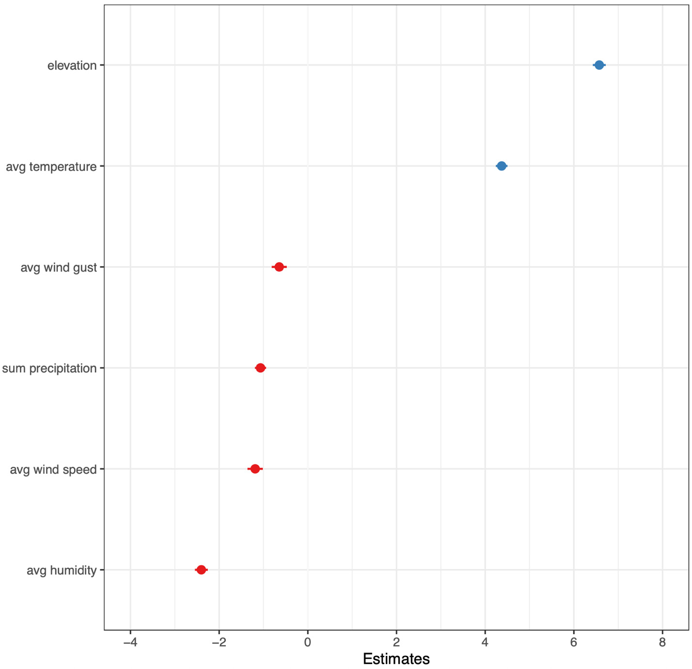 Figure 4a displays the marginal effects for the model incorporating elevation, average temperature, average humidity, and average pressure instead of air density, while Figure 4b presents the corresponding standardized coefficients. Elevation gain shows a large positive effect on driving distance, as does higher average temperature. For context, the model suggests that hitting a shot in Reno (5,280 feet above sea level) rather than at sea level would increase total driving distance by approximately 15 yards. By comparison, a two-standard-deviation increase in elevation (2,361 feet) is associated with an estimated 7-yard increase. Average humidity has a considerable negative effect on driving distance, while the remaining variables exhibit relatively modest negative effects within their measurement ranges.